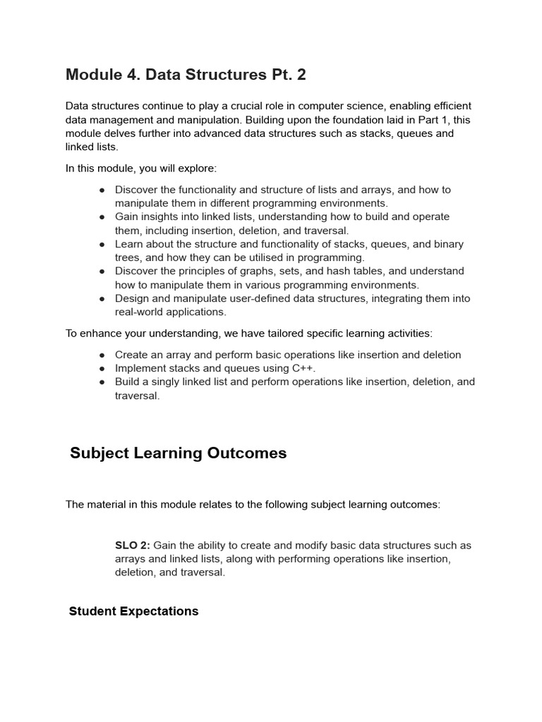 SLO 2: Gain the ability to create and modify basic data structures such as
