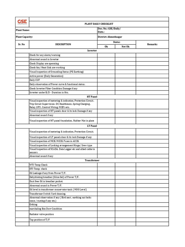 PLANT DAILY CHECKLIST