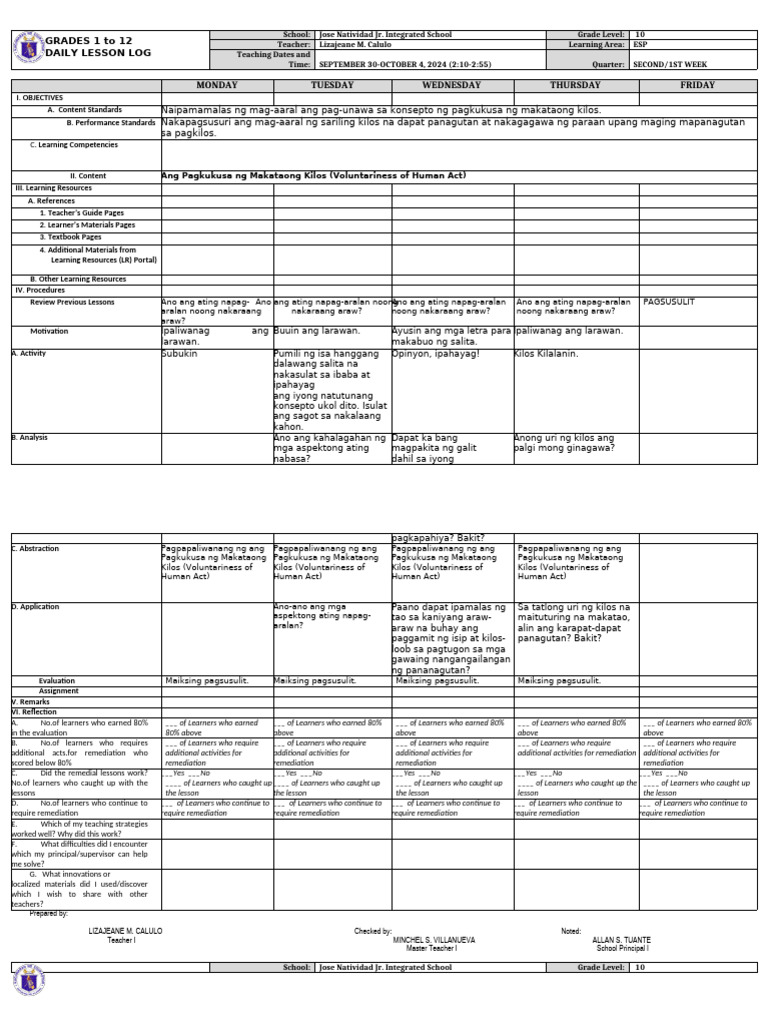 School: Jose Natividad Jr. Integrated School Grade Level: 10