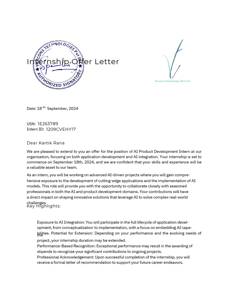 We are pleased to extend to you an offer for the position of AI Product Development Intern at our