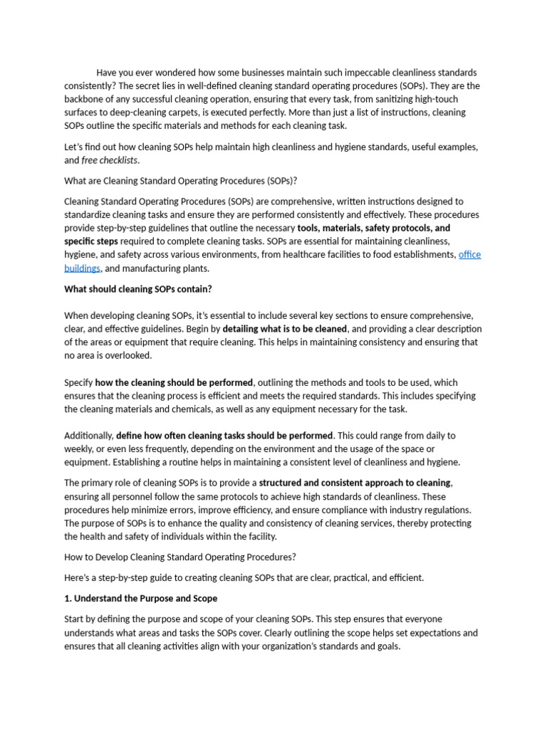 specific steps required to complete cleaning tasks. SOPs are essential for maintaining cleanliness,