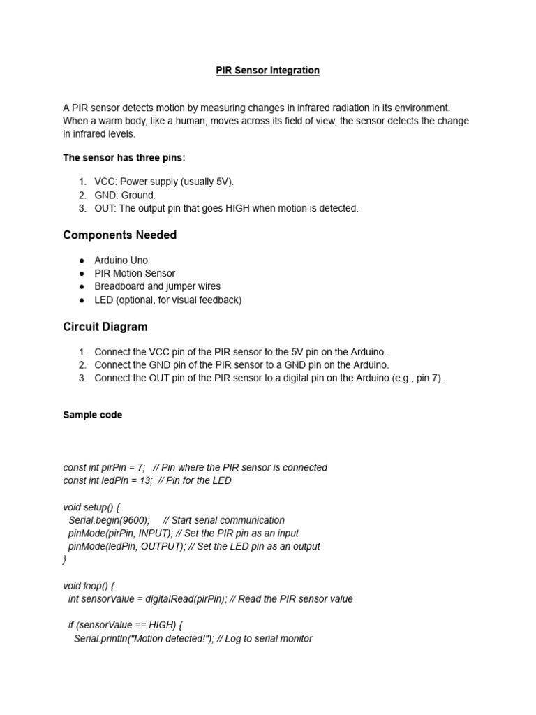 ● Setup Function: Initializes serial communication and sets the modes for the PIR sensor