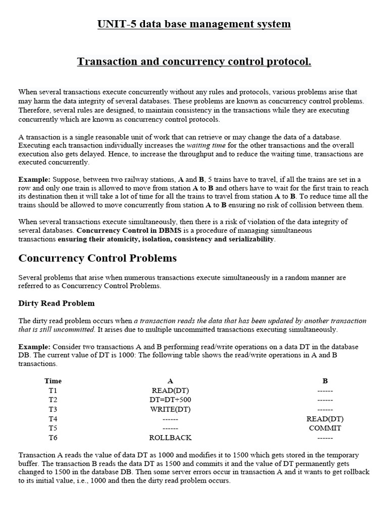 Example: Consider two transactions A and B performing read/write operations on two data DT1 and DT2 in