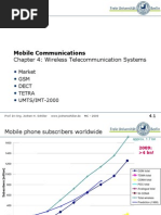 Overview A cellular telephone system links mobile station (MS) subscribers into the public telephone system or to another cellular systems MS subscriber. Information sent between the MS subscriber and the cellular network uses radio communication. This removes the necessity for the fixed wiring used in a traditional telephone installation. Due to this, the MS subscriber is able to move around and become fully mobile, per traveling in a vehicle or on foot. Advantages of Cellular Communications Cellular networks have many advantages over the existing land telephone network. There are advantages for the network provider as well as the mobile subscriber. Frequency Spectrum Introduction The frequency spectrum is very congested, with only narrow slots of bandwidth allocated for cellular communications. (DCS1800) and PCS1900. The list opposite shows the number of frequencies and spectrum allocated for GSM, Extended GSM 900 (EGSM), GSM 1800