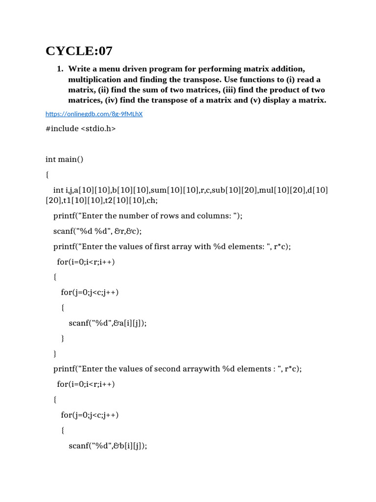 matrices, (iv) find the transpose of a matrix and (v) display a matrix.