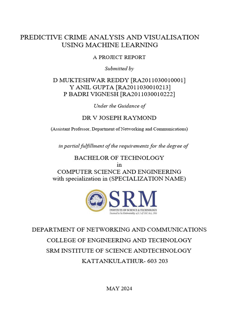 Title of Work : Predictive Crime Analysis and Visualisation using Machine Learning