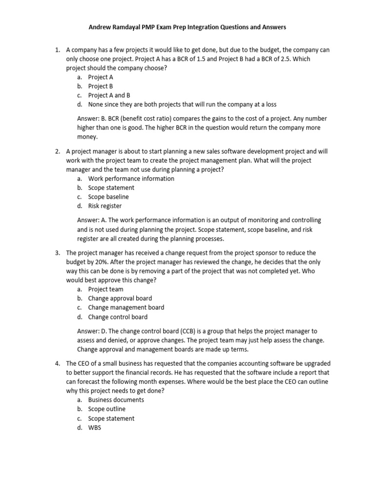 Andrew Ramdayal PMP Exam Prep Integration Questions and Answers