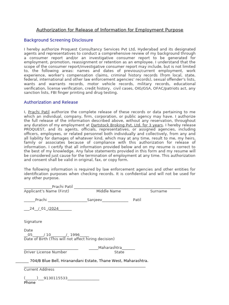 Authorization for Release of Information for Employment Purpose
