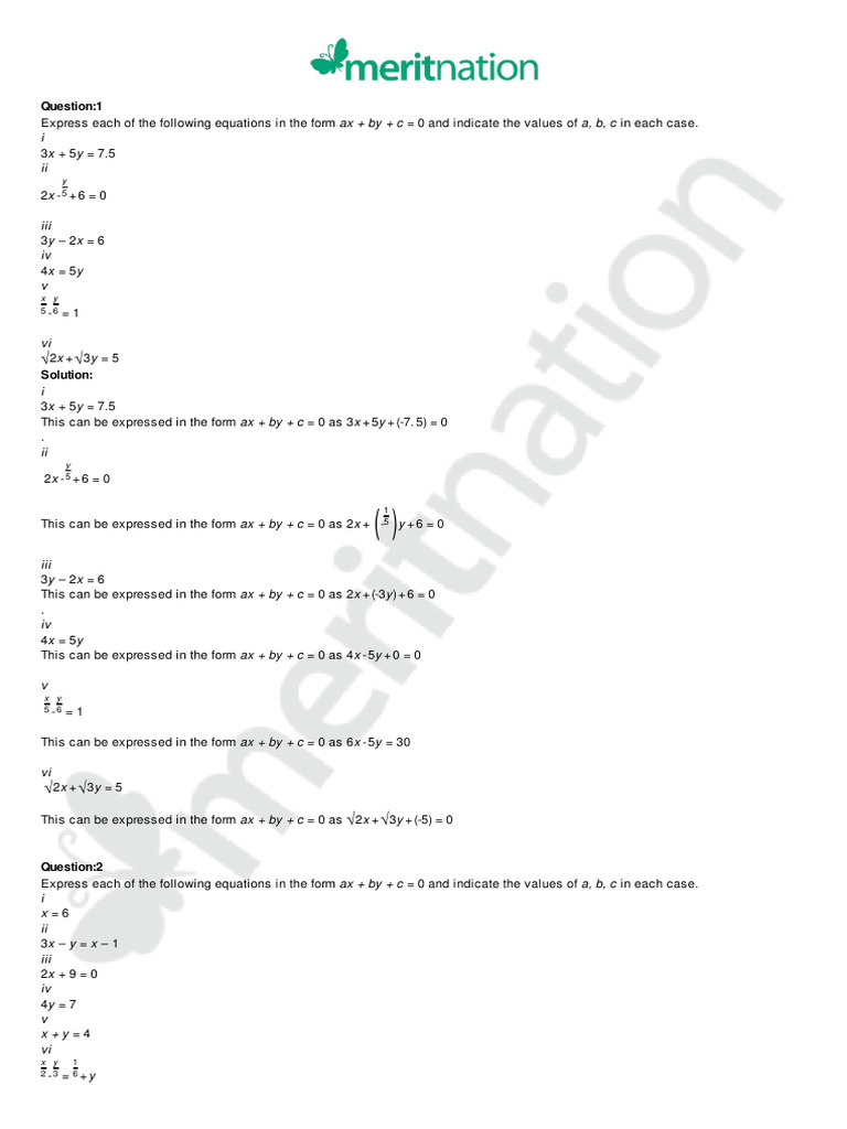 Express each of the following equations in the form ax + by + c = 0 and indicate the values of a, b, c in each case.