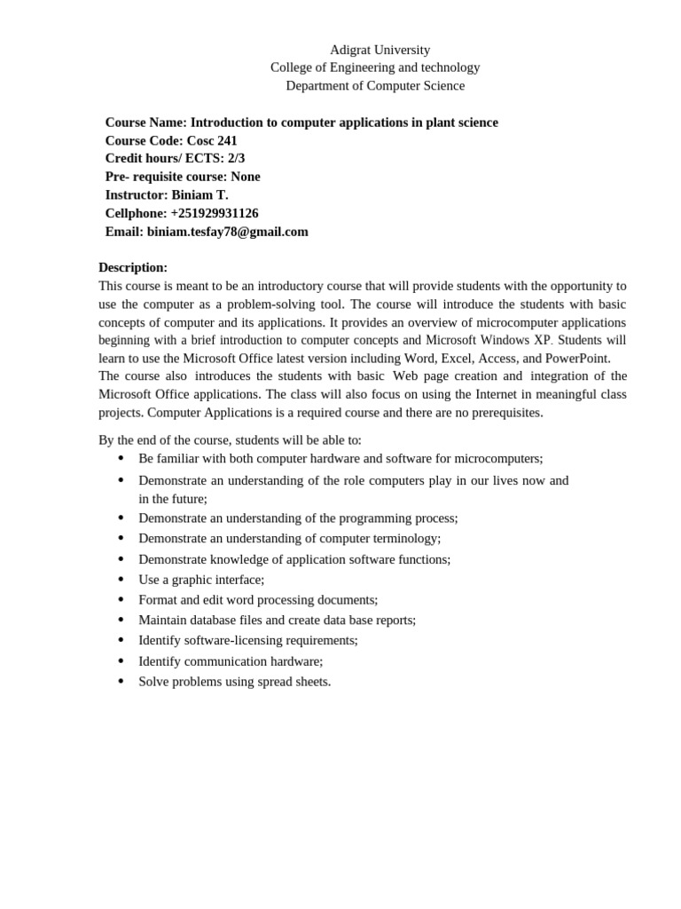 Course Name: Introduction to computer applications in plant science