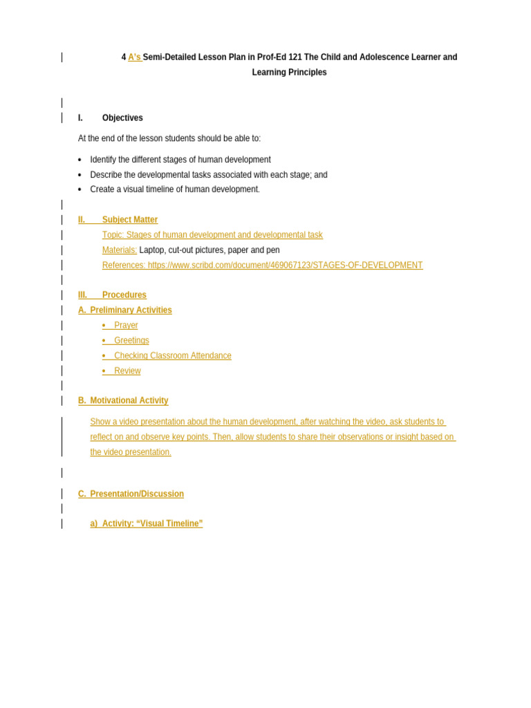 4 A’s Semi-Detailed Lesson Plan in Prof-Ed 121 The Child and Adolescence Learner and