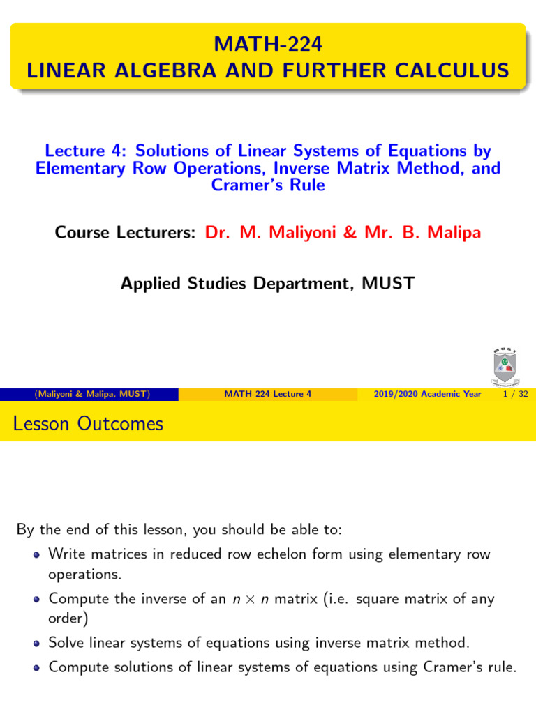 (Maliyoni & Malipa, MUST) MATH-224 Lecture 4 2019/2020 Academic Year 2 / 32