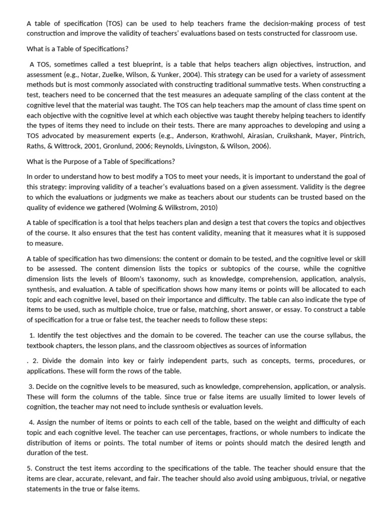A table of specification (TOS) can be used to help teachers frame the decision-making process of test