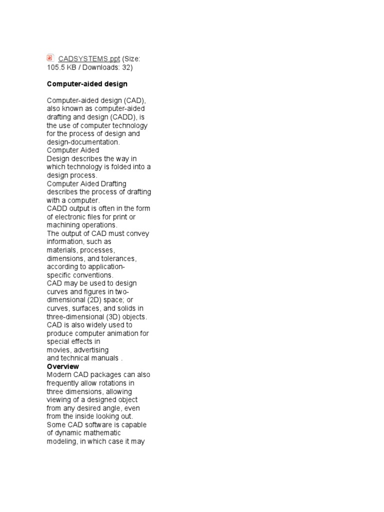 5 KB / Downloads: 32) Computer-aided design Computer-aided design (CAD), also known as computer-aided drafting and design (CADD), is the use of computer technology for the process of design and design-documentation. Computer Aided Design describes the way in which technology is folded into a design process. Computer Aided Drafting describes the process of drafting with a computer. CADD output is often in the form of electronic files for print or machining operations. The output of CAD must convey information, such as materials, processes, dimensions, and tolerances, according to applicationspecific conventions. CAD may be used to design curves and figures in twodimensional (2D) space; or curves, surfaces, and solids in three-dimensional (3D) objects. CAD is also widely used to produce computer animation for special effects in movies, advertising and technical manuals . Overview Modern CAD packages can also frequently allow rotations in three dimensions, allowing viewing of a designed object from any desired angle, even from the inside looking out. Some CAD software is capable of dynamic mathematic modeling, in which case it may