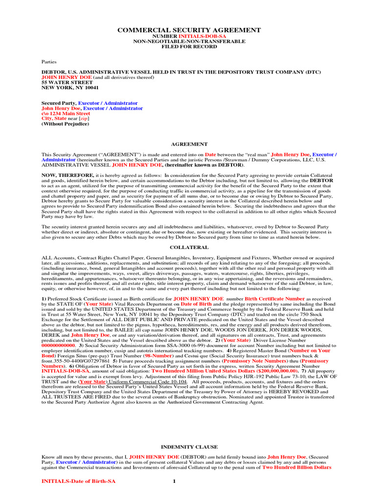 This Security Agreement (“AGREEMENT”) is made and entered into on Date between the “real man” John Henry Doe, Executor /