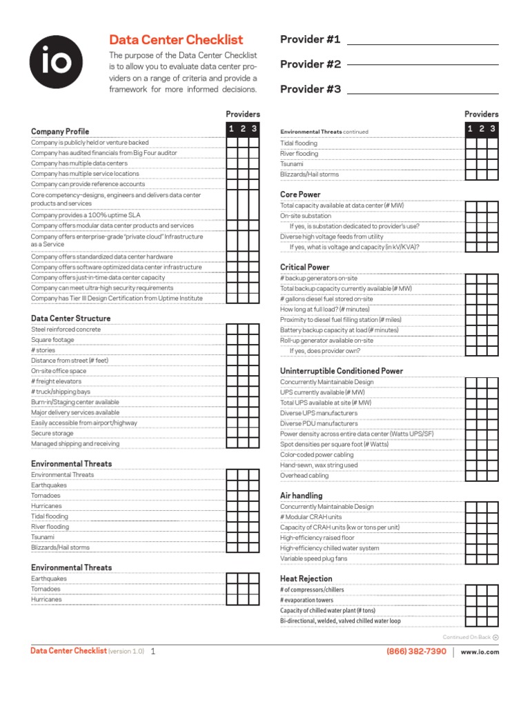 The purpose of the Data Center Checklist is to allow you to evaluate data center providers on a range of criteria and provide a framework for more informed decisions.