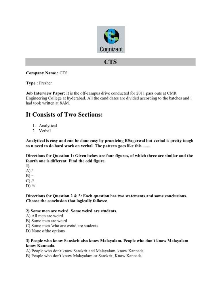 Company Name : CTS Type : Fresher Job Interview Paper: It is the off-campus drive conducted for 2011 pass outs at CMR Engineering College at hyderabad. All the candidates are divided according to the batches and i had took written at 8AM.