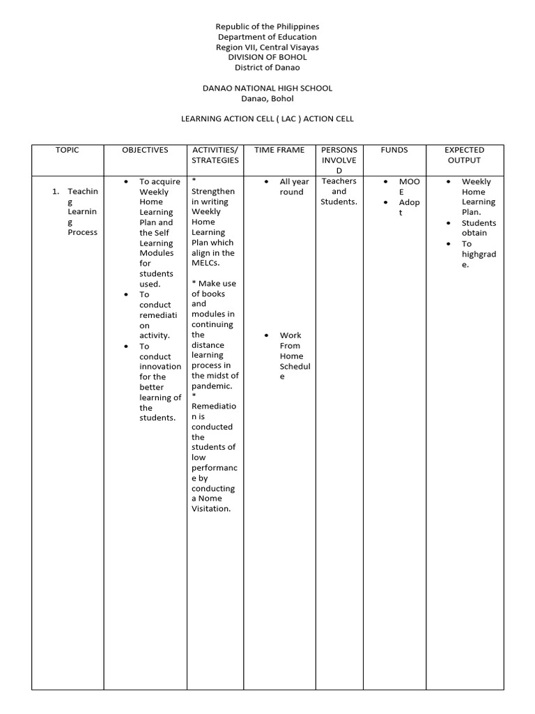 TOPIC OBJECTIVES ACTIVITIES/ TIME FRAME PERSONS FUNDS EXPECTED