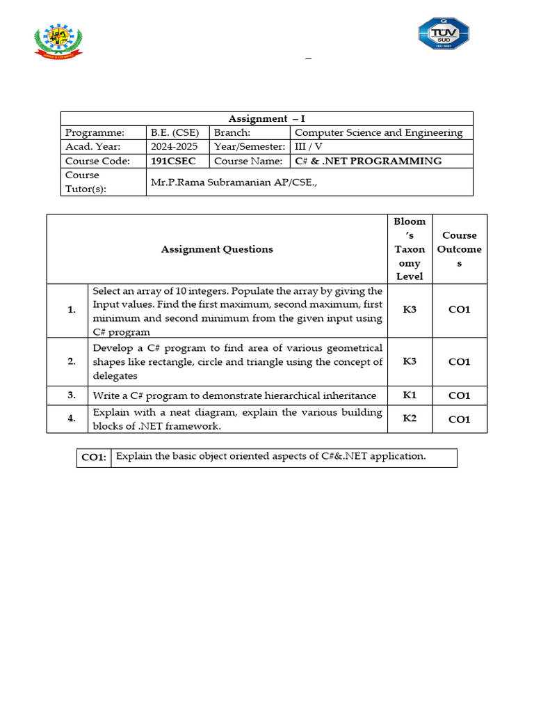 CO1: Explain the basic object oriented aspects of C#&.NET application.