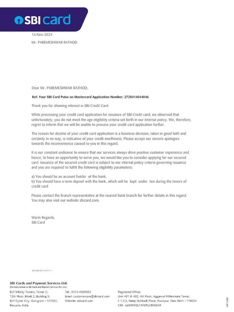 While processing your credit card application for issuance of SBI Credit card, we observed that