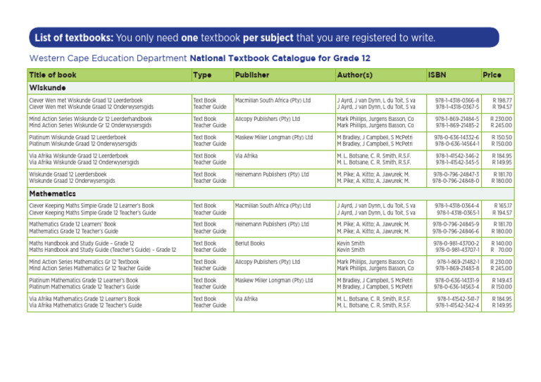 Western Cape Education Department National Textbook Catalogue for Grade 12