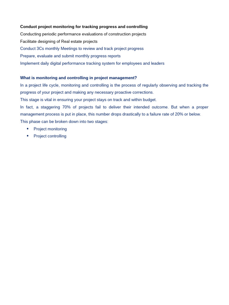 Conduct project monitoring for tracking progress and controlling