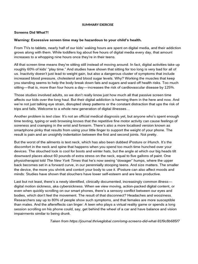 You have been asked to address your peers regarding the effects of excessive screen-time. Summarise the