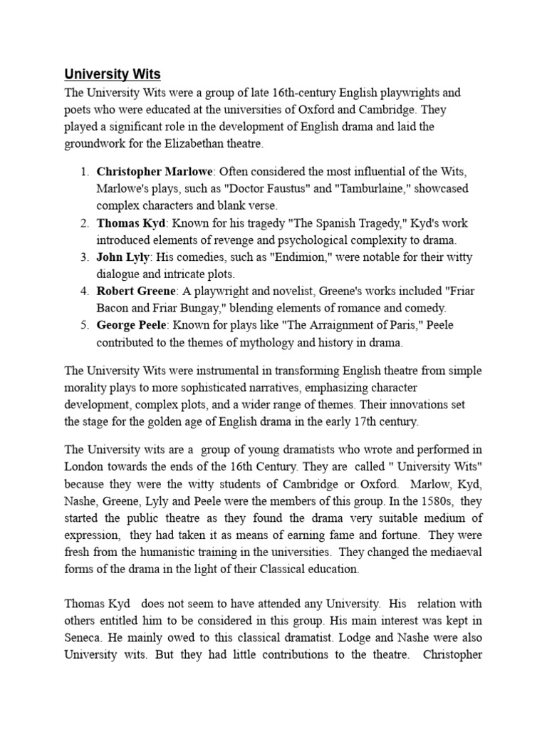 The University wits are a group of young dramatists who wrote and performed in