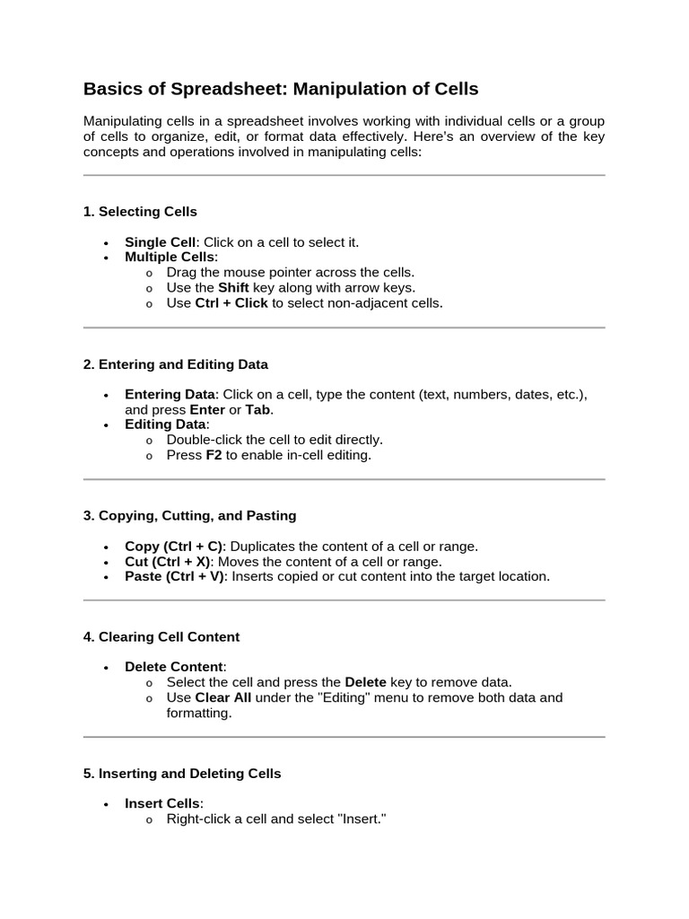 of cells to organize, edit, or format data effectively. Here’s an overview of the key