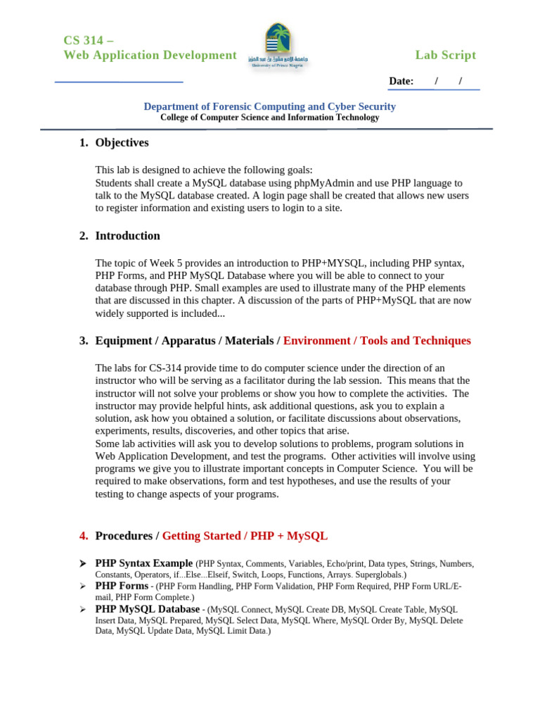 Students shall create a MySQL database using phpMyAdmin and use PHP language to