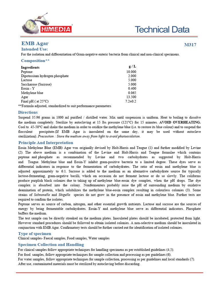 Eosin Methylene Blue (EMB) Agar was originally devised by Holt-Harris and Teague (1) and further modified by Levine