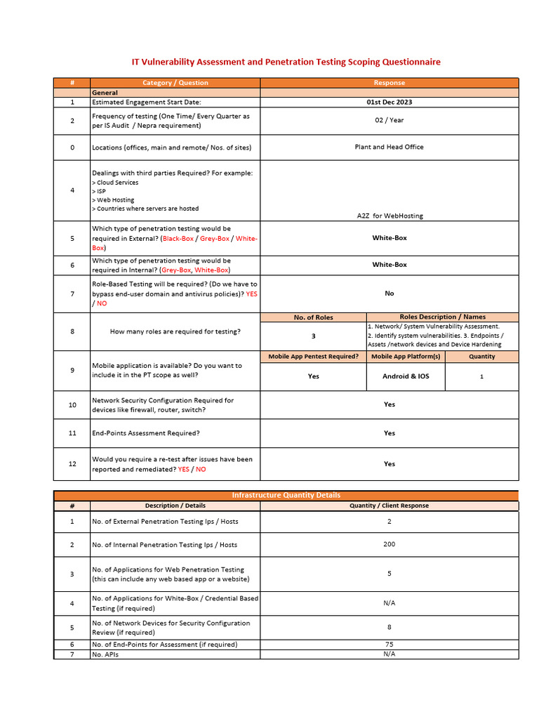 IT Vulnerability Assessment and Penetration Testing Scoping Questionnaire