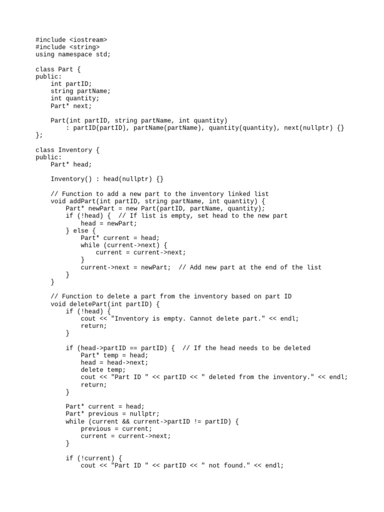 cout << "Part ID " << partID << " deleted from the inventory." << endl;