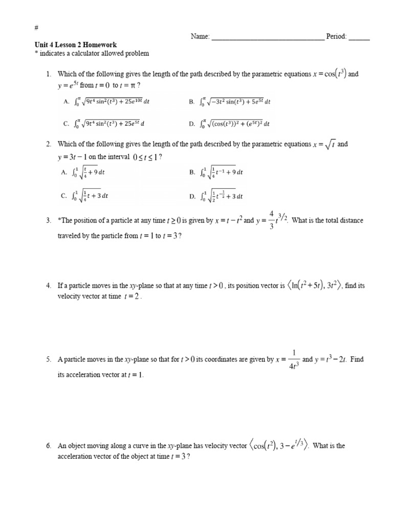 6. An object moving along a curve in the xy-plane has velocity vector . What is the