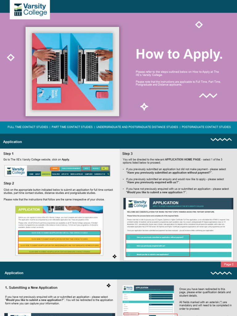 Go to The IIE’s Varsity College website, click on Apply. You will be directed to the relevant APPLICATION HOME PAGE - select 1 of the 3