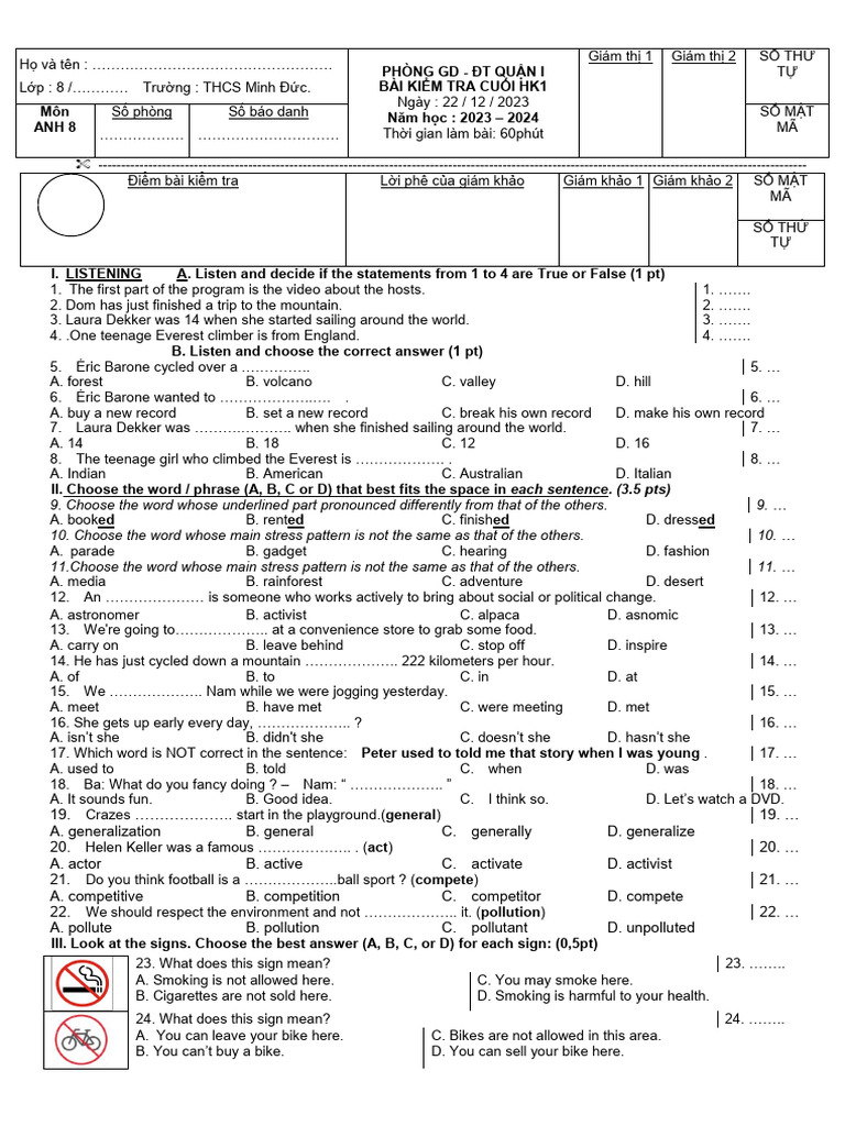 Lớp : 8 /………… Trường : THCS Minh Đức. BÀI KIỂM TRA CUỐI HK1