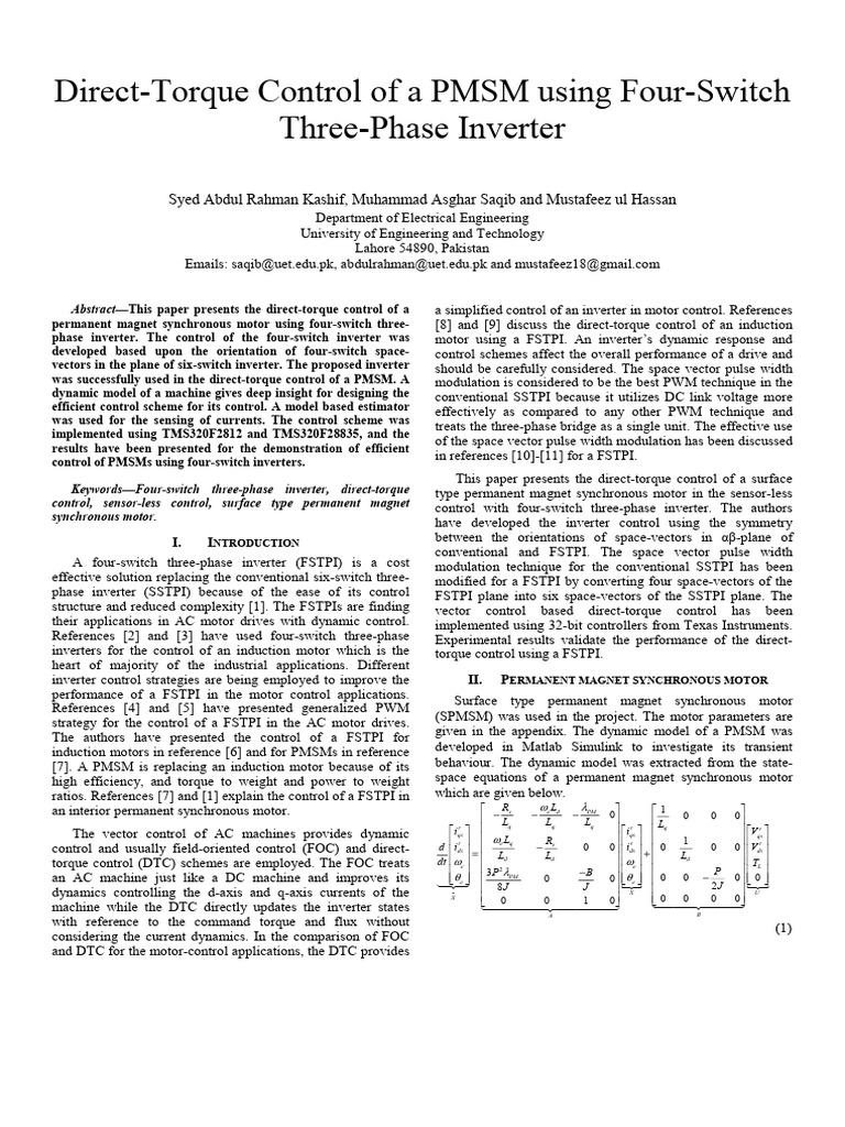 permanent magnet synchronous motor using four-switch three- [8] and [9] discuss the direct-torque control of an induction