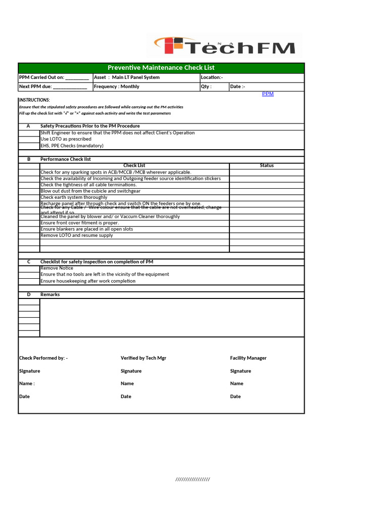 PPM Carried Out on: _________ Asset : Main LT Panel System Location:-