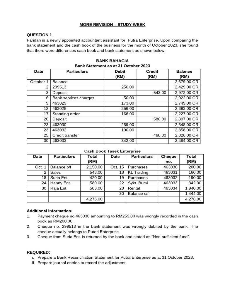 i. Prepare a Bank Reconciliation Statement for Putra Enterprise as at 31 October 2023.