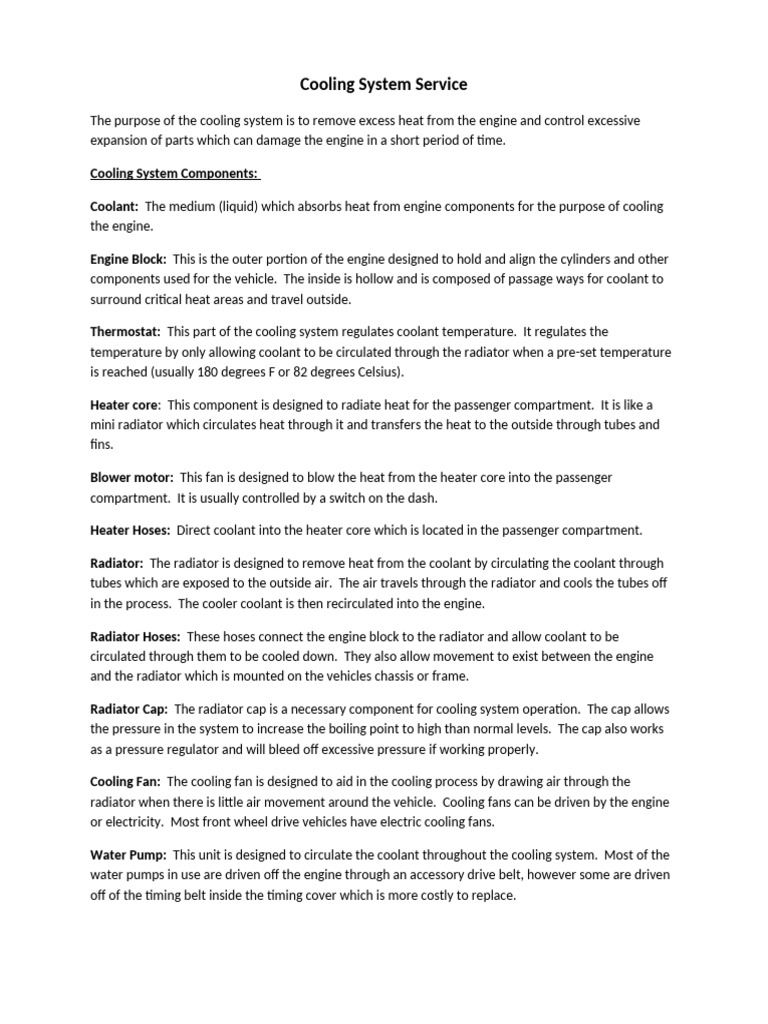 The purpose of the cooling system is to remove excess heat from the engine and control excessive