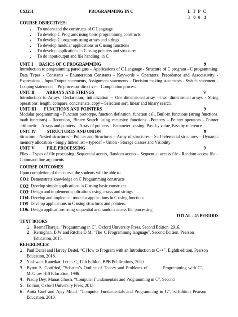 1. ReemaThareja, “Programming in C”, Oxford University Press, Second Edition, 2016.