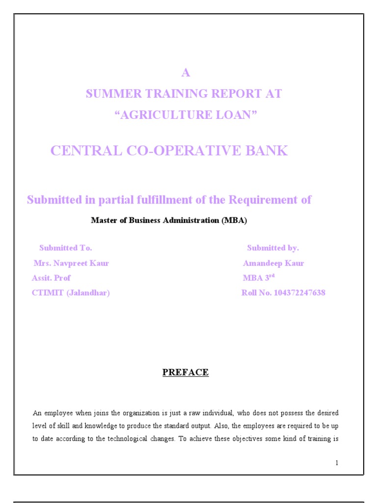 required. In other words the organization needs to maintain a viable and knowledgeable work force to meet the current and future challenges. For this training is the only medium/method/weapon by which organization can achieve the objectives. So training is a continuous process, which exist till the organization sustains. In this session I took training in THE CENTRAL COOPERATIVE BANK, in loan section of that bank in which I got the chance to know the procedure by which bank lends money to its members. Since it is a cooperative bank so it gives loan to its members only, hence an applicant has to become member of this bank before borrowing money from it. The project work about the survey is a small piece of research work in various aspects of the training. While carrying out I got opportunities to interact with employees at various levels and the people which enhanced my practical knowledge and experience in regard to the topic. In this report I have shown the loans provided by the bank and its recovery procedure .I also include current facts and figures related to the topic.
