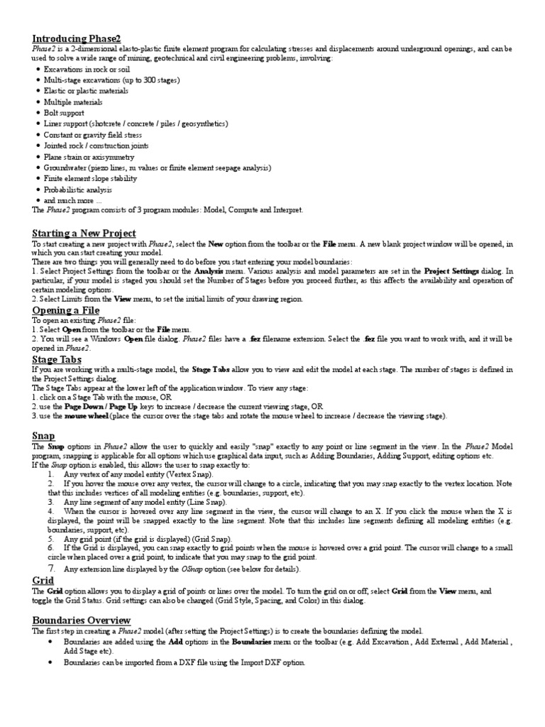 Phase2 is a 2-dimensional elasto-plastic finite element program for calculating stresses and displacements around underground openings, and can be used to solve a wide range of mining, geotechnical and civil engineering problems, involving: Excavations in rock or soil Multi-stage excavations (up to 300 stages) Elastic or plastic materials Multiple materials Bolt support Liner support (shotcrete / concrete / piles / geosynthetics) Constant or gravity field stress Jointed rock / construction joints Plane strain or axisymmetry Groundwater (piezo lines, ru values or finite element seepage analysis) Finite element slope stability Probabilistic analysis and much more ... The Phase2 program consists of 3 program modules: Model, Compute and Interpret.