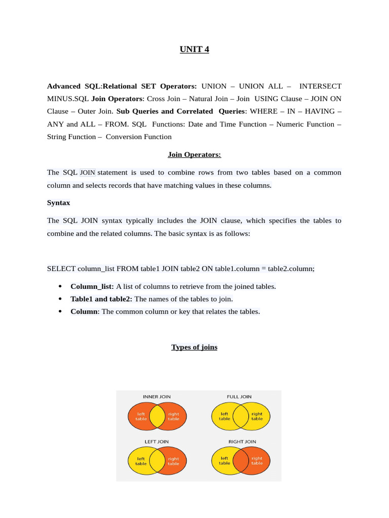 MINUS.SQL Join Operators: Cross Join – Natural Join – Join USING Clause – JOIN ON