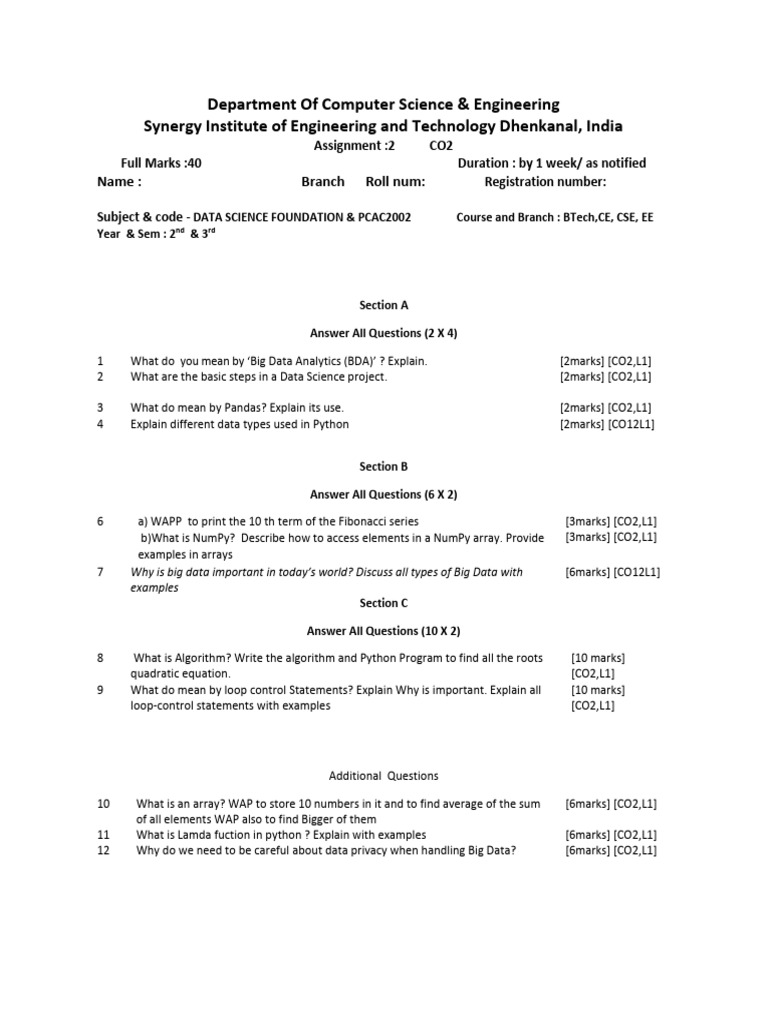 Subject & code - DATA SCIENCE FOUNDATION & PCAC2002 Course and Branch : BTech,CE, CSE, EE