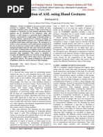 Most applications, such as recognizing particular static hand signal, require a richer description of the shape of the input object than image moments provide. If the hand signals fell in a predetermined set, and the camera views a close-up of the hand [10], we may use an example-based approach, combined with a simple method top analyze hand signals called orientation histograms.[11] The user shows the system one or more examples of a specific hand shape. The computer forms and stores the corresponding orientation histograms. In the run phase, the computer compares the orientation histogram of the current image with each of the stored templates and selects the category of the closest match, or interpolates between templates, as appropriate. This method should be robust against small differences in the size of the hand but probably would be sensitive to changes in hand orientation. III. AMERICAN SIGN LANGUAGE