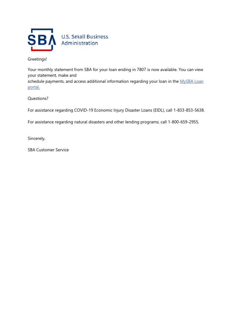 Your monthly statement from SBA for your loan ending in 7807 is now available. You can view