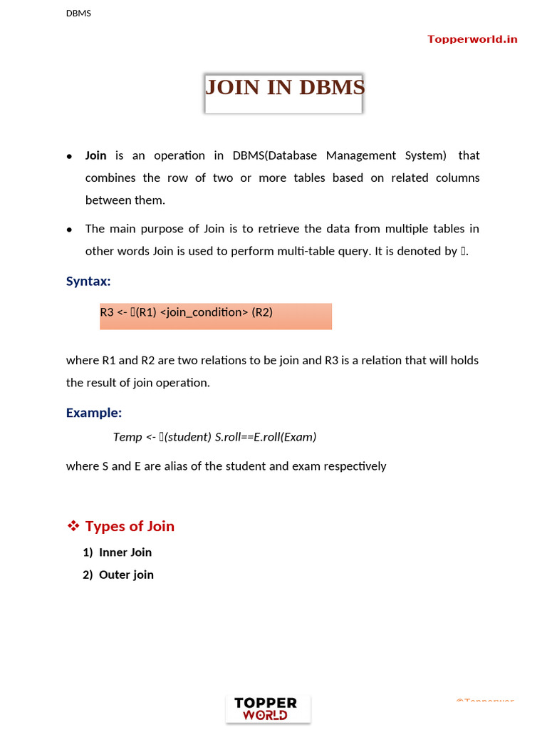 other words Join is used to perform multi-table query. It is denoted by ⨝.
