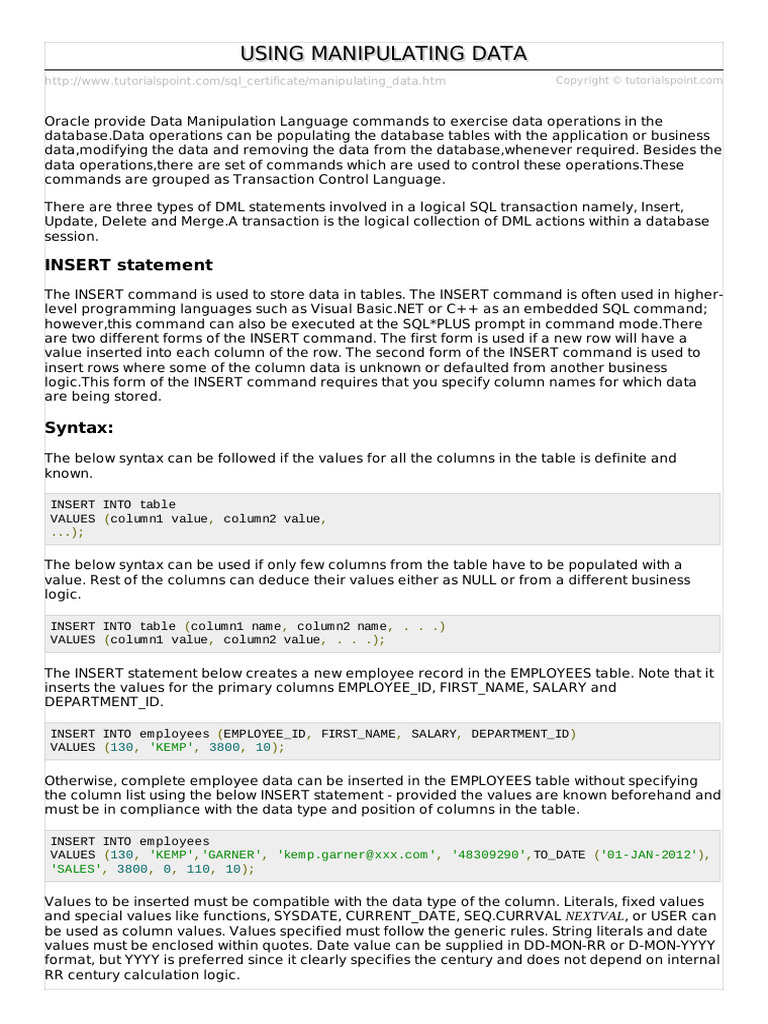 http://www.tutorialspoint.com/sql_certificate/manipulating_data.htm Copyright © tutorialspoint.com