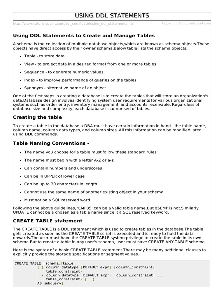 http://www.tutorialspoint.com/sql_certificate/using_ddl_statements.htm Copyright © tutorialspoint.com